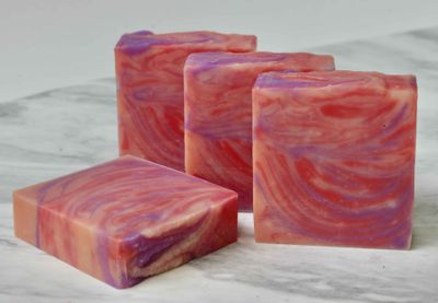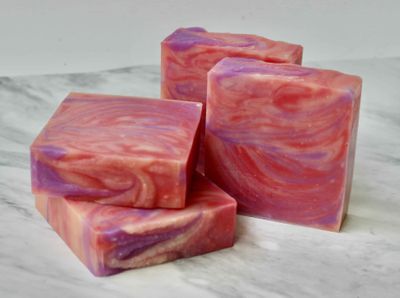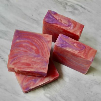 Ingredients: Coconut Oil, Soybean Oil (hydrogenated), Rice Bran Oil, Olive Oil, Shea Butter, Distilled Water, Coconut Cream, Avocado Oil, Castor Oil, Lye, Victorian Rose Fragrance Oil, Rose Petals Fragrance Oil, Essential Oil of Patchouli, Mica Colour.