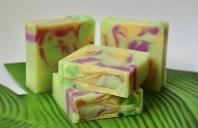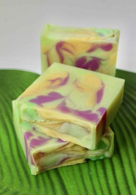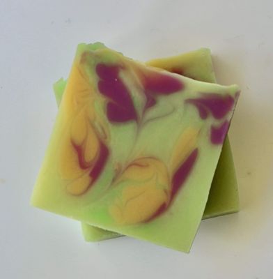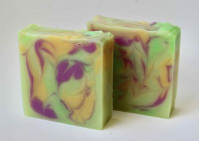 Ingredients: Olive Oil, Coconut Oil, Soybean Oil (hydrogenated), Rice Bran Oil, Shea Butter, Distilled Water, Avocado Oil, Castor Oil, Lye, Aloe Vera Concentrate, Essential Oils of Cananga, Litsea, and Rose Geranium, Mica and Neon Colours.