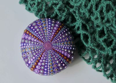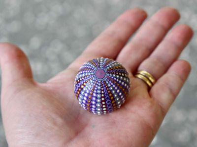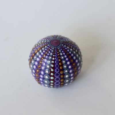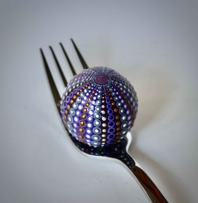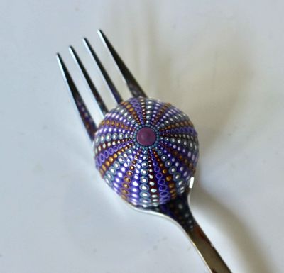 Lovingly crafted in purple tones - using indoor outdoor acrylic paints with a light spray varnish. Little Bitty Kina will fit into a teaspoon, but I used a fork in the pictures to give a better contrast. Don't be fooled by its size - there are lots of little dots and it took a long time to paint.
